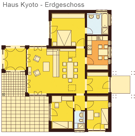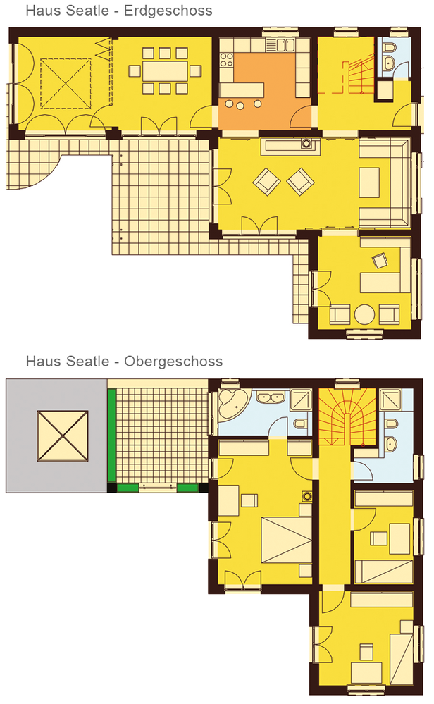Diese Entwürfe verknüpfen Innenräume mit Außenräumen. Wenn Bauherren sich entscheiden ein Grundstück zu kaufen und ein Haus zu bauen, dann wollen sie den Garten in ihr tägliches Leben einbeziehen. Durch geschickte Anordnung von architektonischen Elementen wie Sonnenterrasse, Loggia, Wintergarten, Balkone, große Fenster und in den Garten geschobene Räume wie Essplatz und Wohnzimmer wird das Leben mit der Natur erreicht.