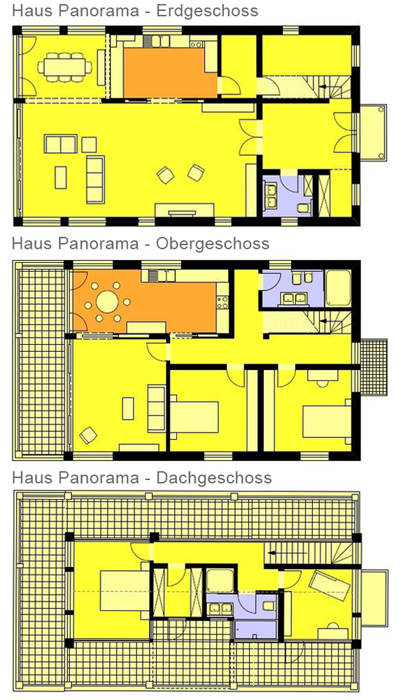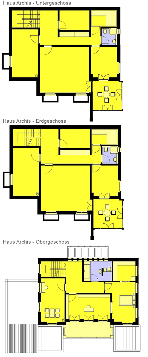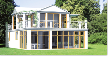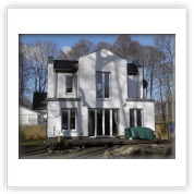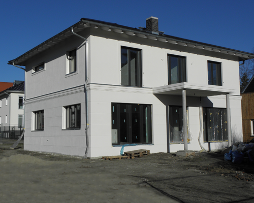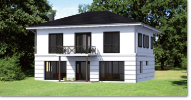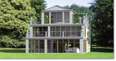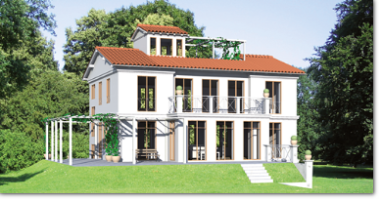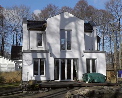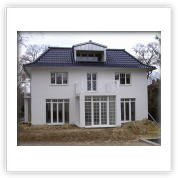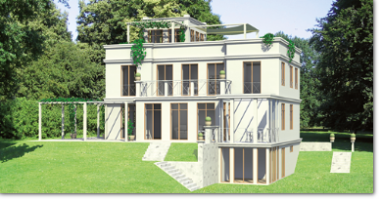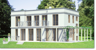 Die äußere Gestalt folgt einem postmodernen Ansatz und erinnert an das preußische Arkadien oder die Seenbäderarchitektur mit Säulen, Giebeln, Pergolen und Loggien. Eine Besonderheit besteht in der Wiederentdeckung der Idee einer Turmvilla mit einem Aussichts-